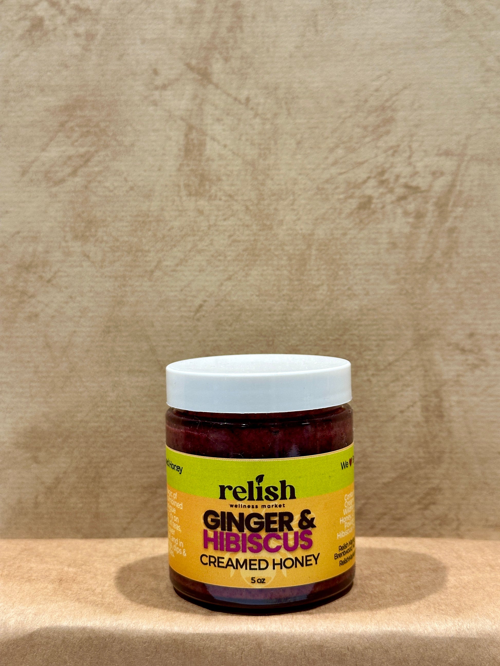 Raw, Unfiltered Creamed Honey infused with Hibiscus & Ginger.