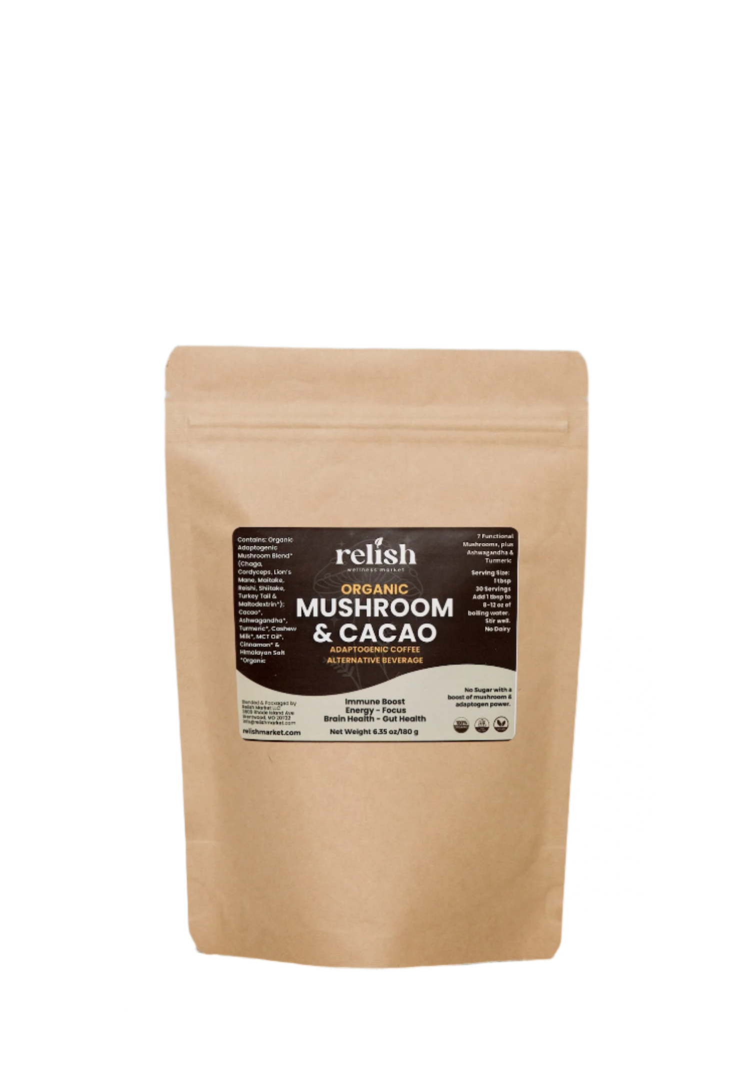 Organic Mushroom & Cacao Coffee Blend by Relish Market is an Adaptogenic Coffee alternative beverage powder that includes 7 Functional Mushrooms, plus Ashwagandha, Dandelion Root & Turmeric.